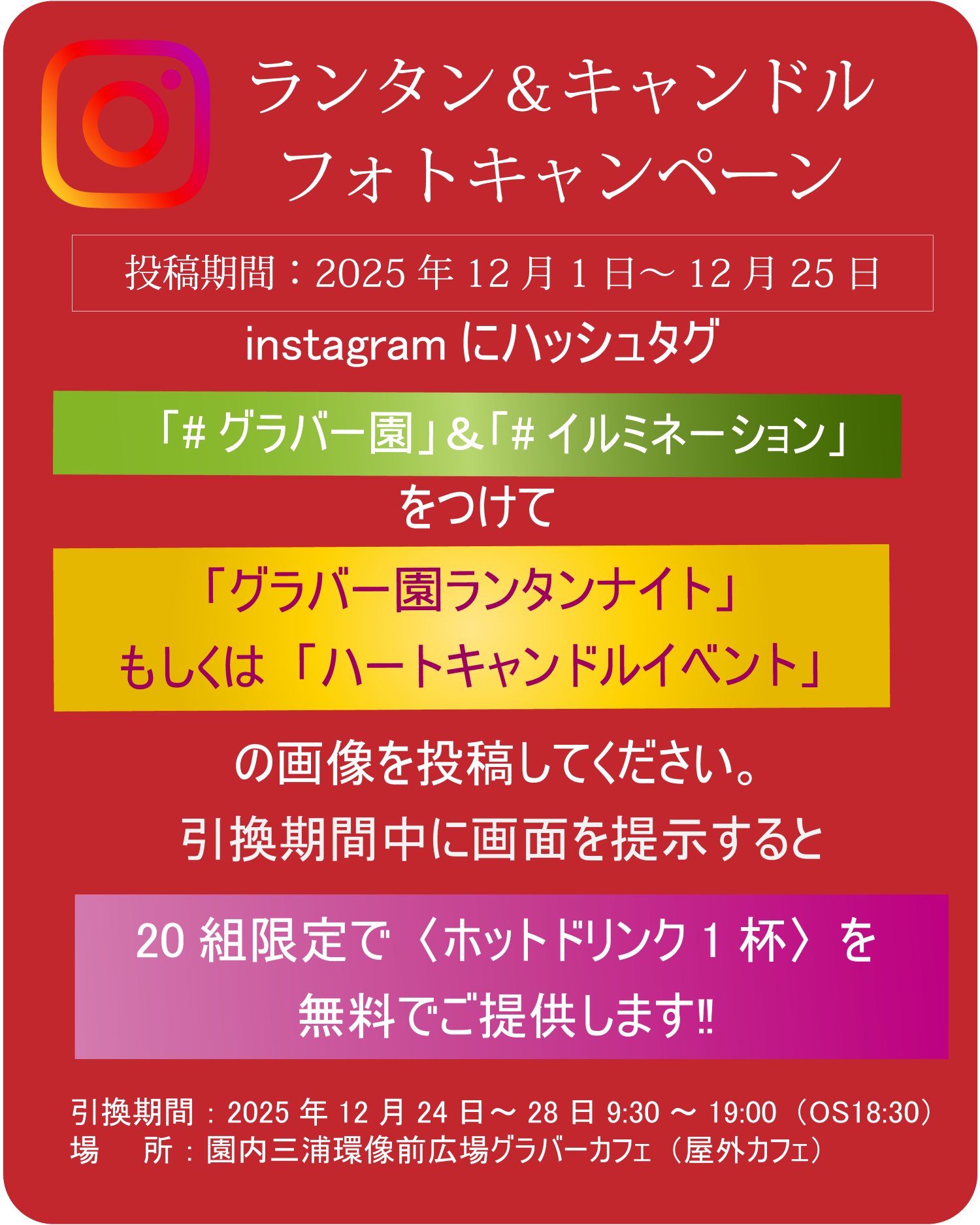 引き換え期間中(12/24〜28)に、投稿画面をグラバーカフェで提示すると、20組限定でホットドリンク1杯を無料プレゼントいたします!