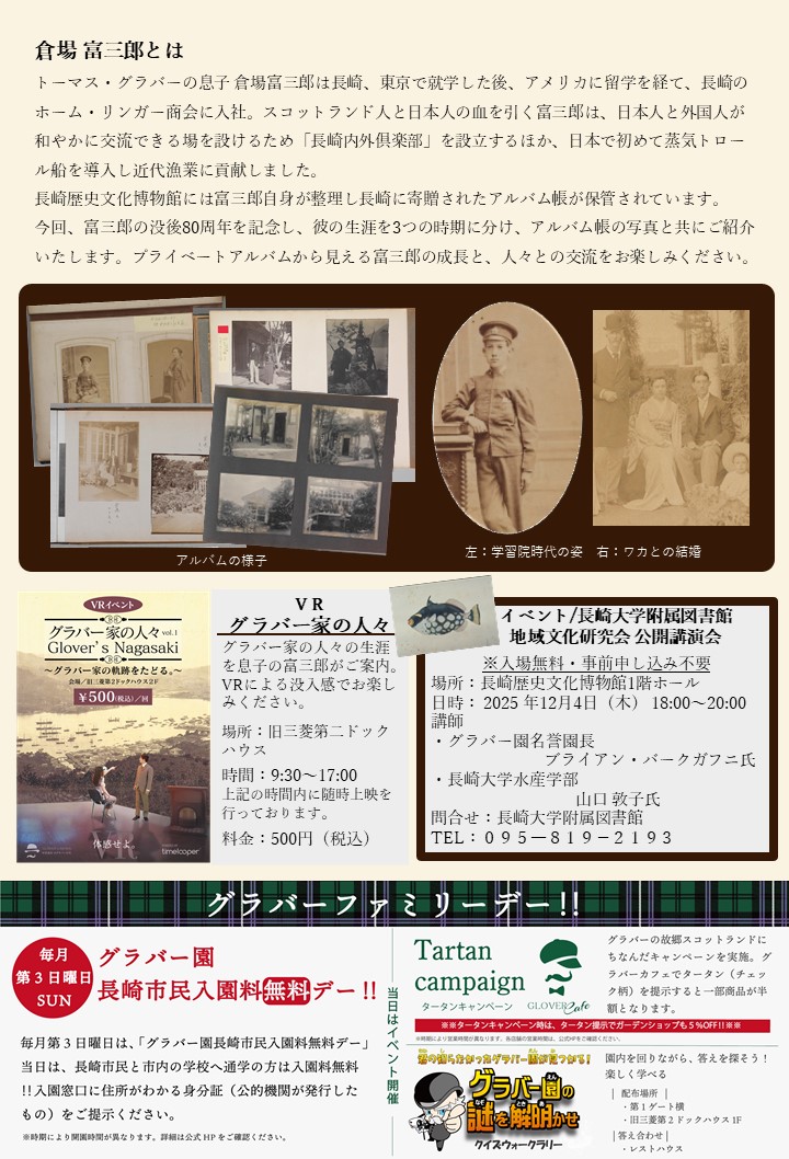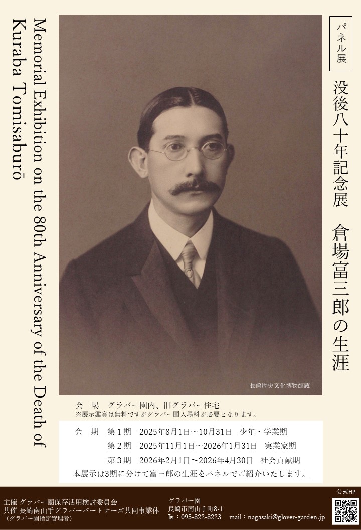 今年2グラバーの息子倉場富三郎の没後80周年を迎えました。グラバー園では、ただいまこれを記念したパネル展を開催しています。