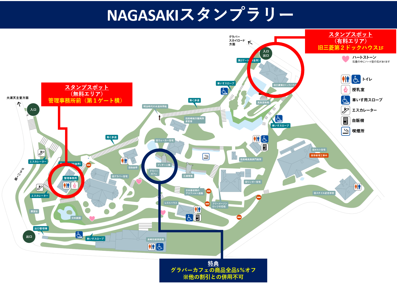 スタンプ取得画面提示で〈参加者特典〉として、グラバーカフェにて全品5%割引(その他クーポンとの併用不可)